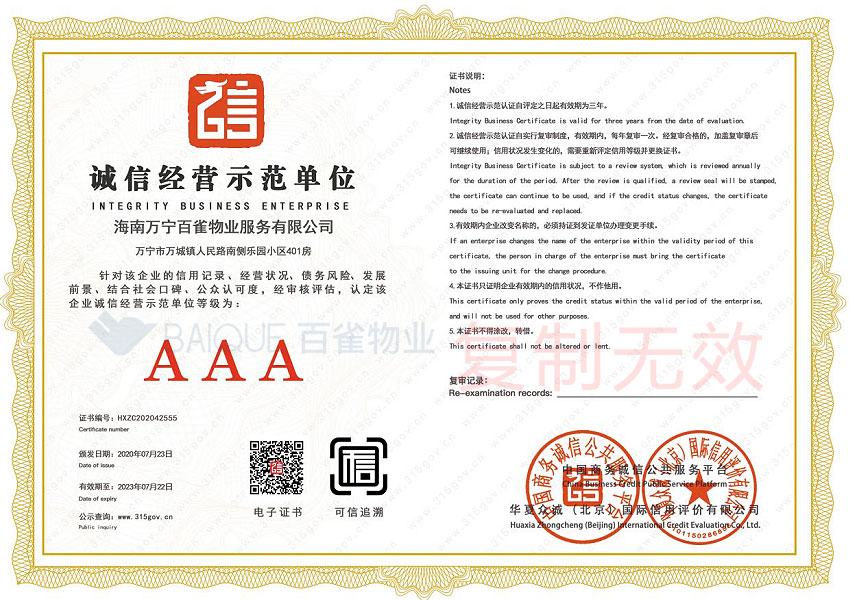 诚信经营示范单位