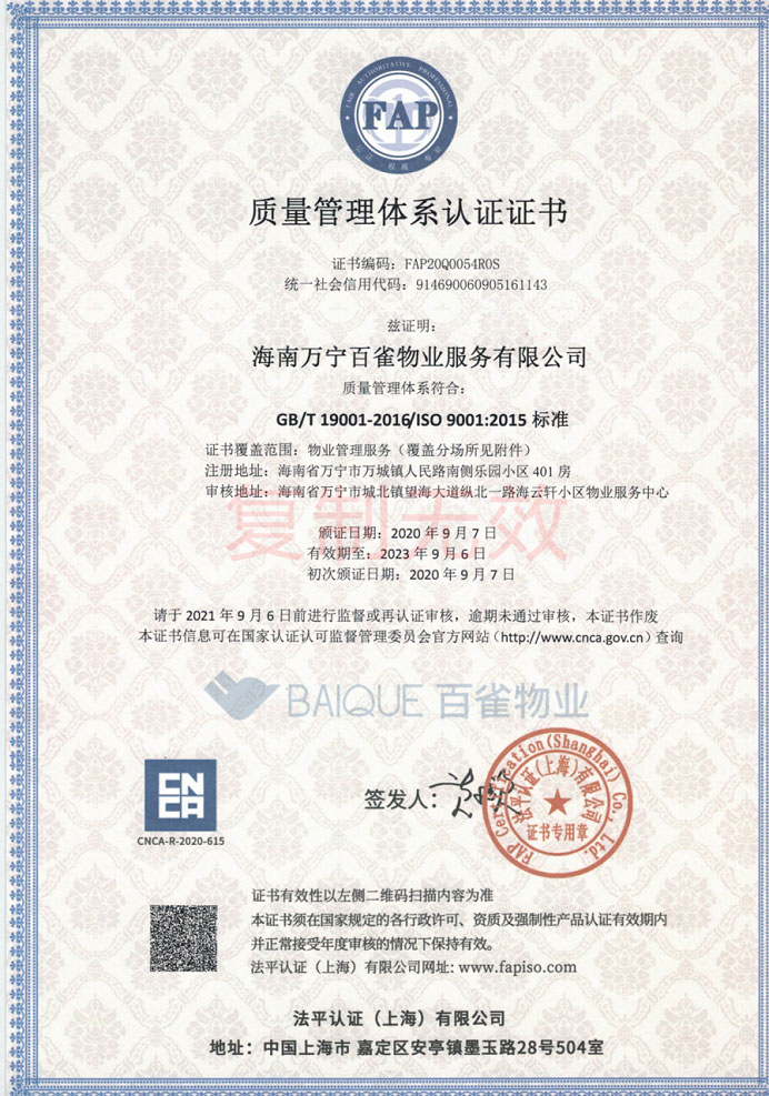 质量管理体系认证证书