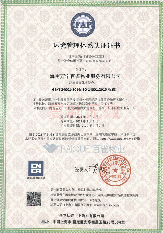 环境管理体系认证证书