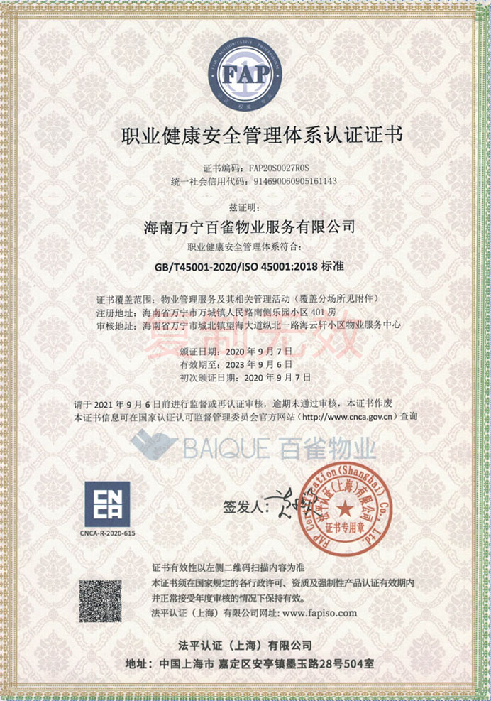 职业健康安全管理体系认证证书